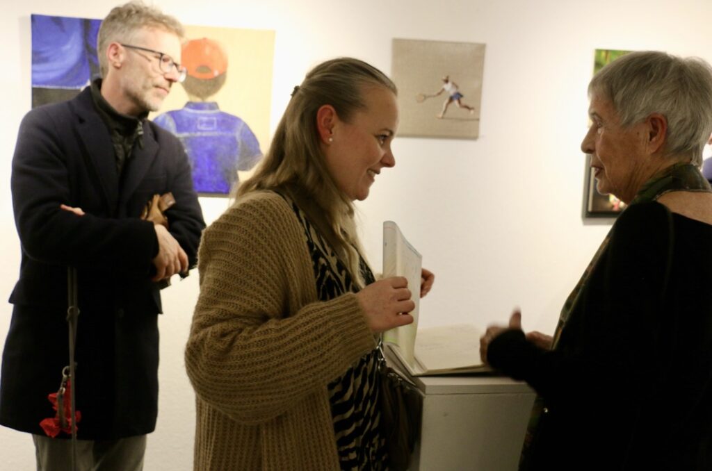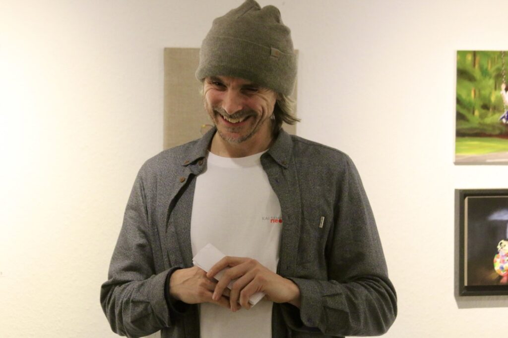 Dass sie einer „kreativen Familie“ entstammt und ihr „Kunst“ mit in die Wiege gelegt wurde, zeigte sich am Eröffnungsabend durch jene bemerkenswerte Einführung ihres in Köln lebenden Bruders Kai Niederhausen, der als Grafity-Künstler „Semor“ weltweit unterwegs ist: „Nina kann mit ihren Bildern ganz eigene Geschichten erzählen, sie vermag mit ihren Motiven Sehnsüchte zu entwickeln.“ Er sei beeindruckt, wie es ihr gelinge, auf der Leinwand Fürsorge, Zerbrechlichkeit und Glück darzustellen. „Sie hat ein feines Gespür im Leben und in der Malerei. Mit den Momentaufnahmen, die sie auf der Leinwand einfängt, löst sie etwas aus.“ Ihre kleinformatigen Arbeiten ermöglichten für Viele erstmals einen direkten Zugang zur Kunst. Kai Niederhausen begann mit elf Jahren das Sprayen als gestalterische Ausdrucksform für sich zu entdecken. Seitdem sind dreißig Jahre vergangen und heute betreibt er diese Kunstform ganz professionell.