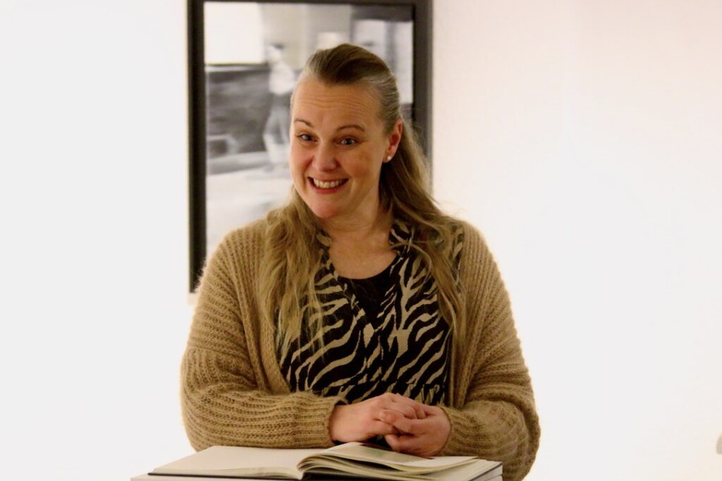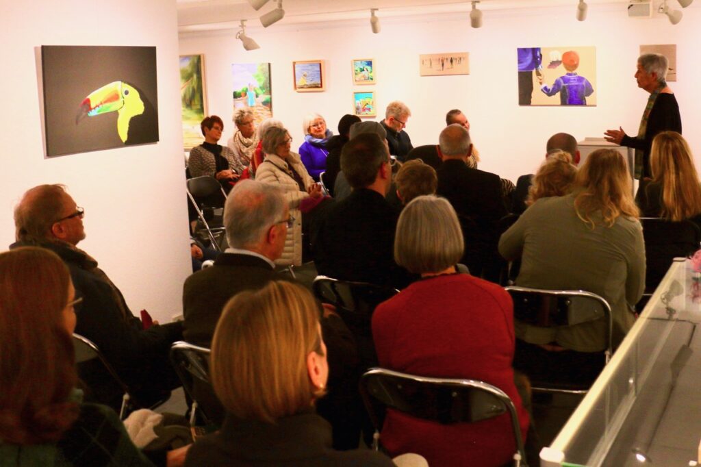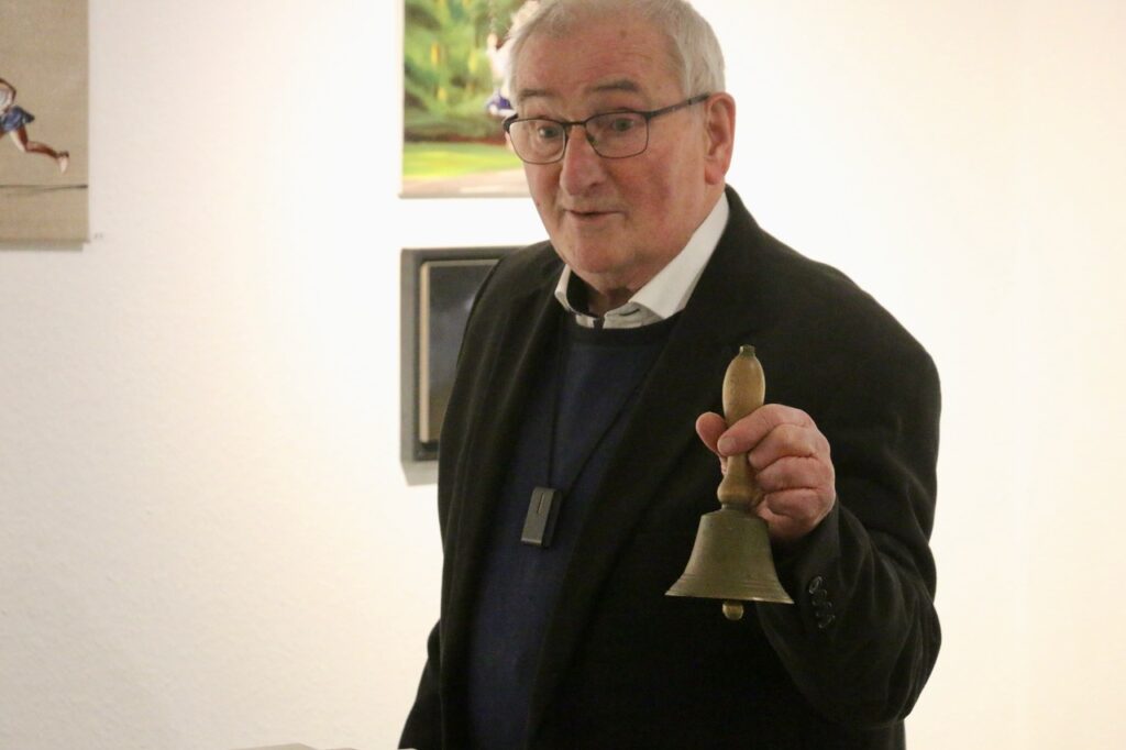 So viele Kinder sind noch nie bei einer Ausstellungeröffnung hier gewesen, staunte Dieter Siebel. Und die jungen Gäste konnte er mit einer historischen Milchmann-Schelle beeindrucken. Er begrüßte die überaus zahlreichen Besucher zur Vernissage „BEGEGNUNGEN“, einer Werkschau, in der Bilder von Nina Niederhausen im 4Fachwerk-Museum gezeigt werden.