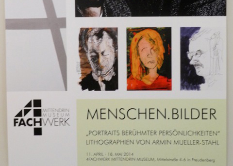 Die Ausstellung in der Freudenberger Altstadt besuchte jetzt auch Kreiskulturreferent Wolfgang Suttner. Dieter Siebel gab Hinweise zu einzelnen Werken.Die Ausstellung „MENSCHEN.BILDER“, in der Lithographien berühmter Persönlichkeiten von Armin Mueller-Stahl im Freudenberger Stadtmuseum präsentiert werden, wird bis einschließlich Sonntag, 25. Mai 2014 verlängert. „Das Interesse an dem Multitalent Armin Mueller-Stahl in all seinen Facetten ist wirklich groß“, begründet 4FACHWERK-Vorsitzender Dieter Siebel die