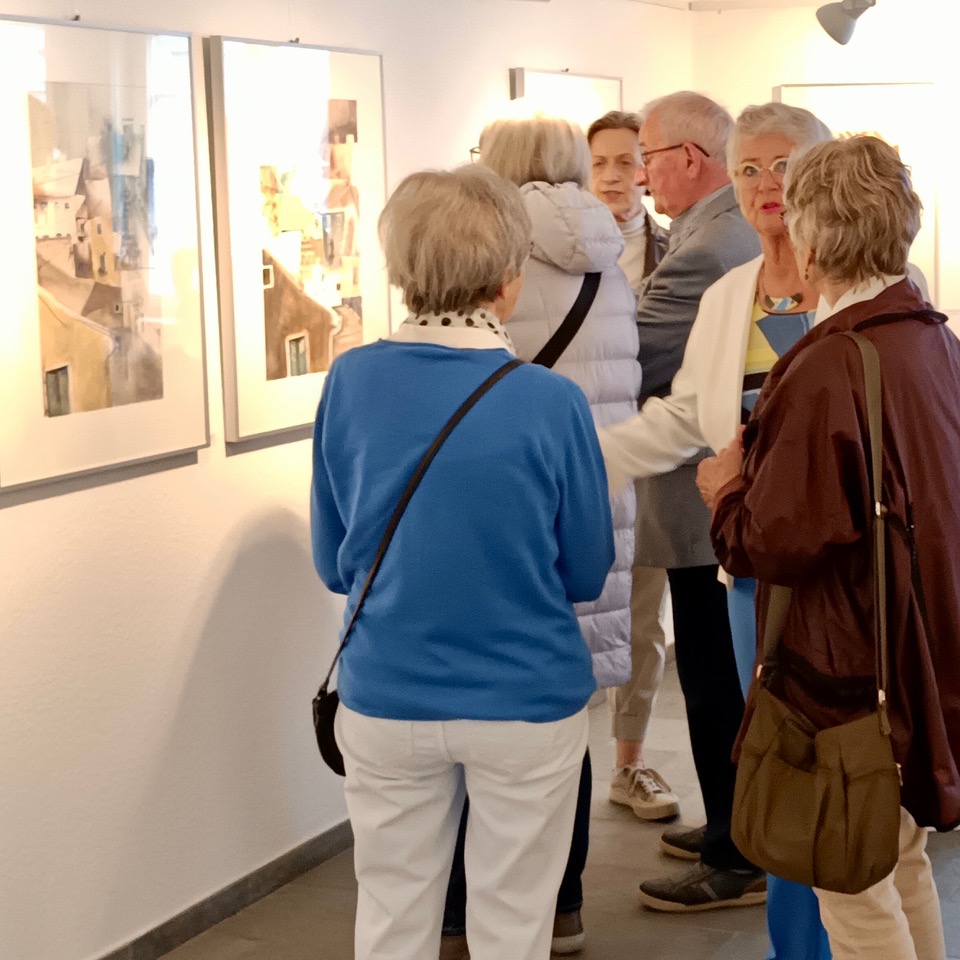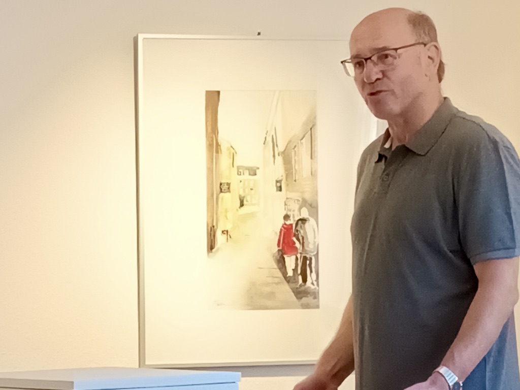 Im Gespräch mit Dr. Ingrid Leopold, die für den 4Fachwerk-Museumsverein federführend die Ausstellungen kuratiert, verdeutlicht sie bei der Ausstellungseröffnung, wie sie die interessante Balance zwischen ihren Motiven und dem Medium Aquarell findet. Es sei dann eine künstlerische Interpretation, die gleichwohl den Charakter der gebauten Umwelt zeigt.