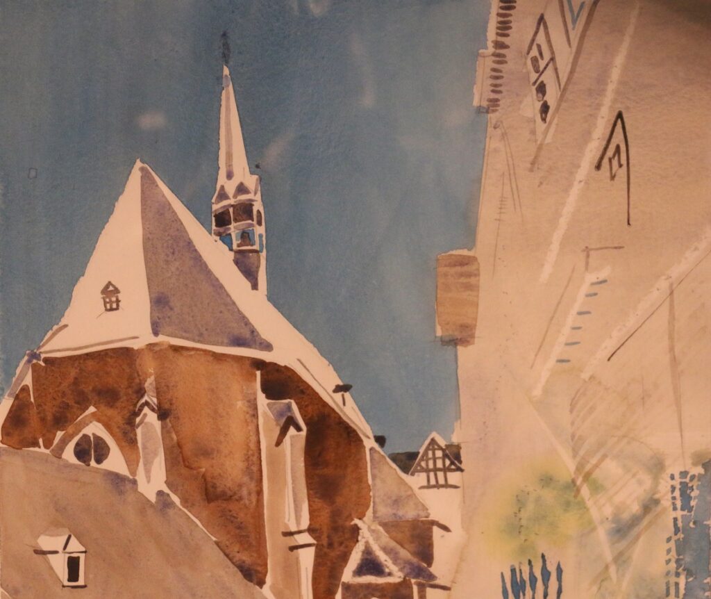 Das Ergebnis ihrer Darstellungstechnik können die Besucher des 4Fachwerk-Museums bis zum 7. Juli 2024 nachvollziehen. Christine Jantzen wohnt seit 1966 in Marburg und gründete ihr Architekturbüro, mit dem sie sich auch intensiv Aufgaben der Denkmalpflege widmet. Sie studieret an der Universität Siegen und am Kent Institute of Art und Design in Canterbury. Der Titel der Ausstellung „ARCHITEKT(O)UR“ verbindet ihre Profession mit jener Reiselust, mit der sie die vielfältigen Eindrücke des Lebens sammelt, um sie als künstlerisch gestaltete Impressionen in ihren Werken fortleben zu lassen.
