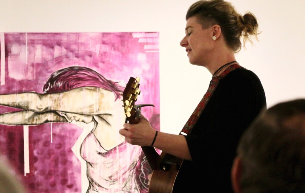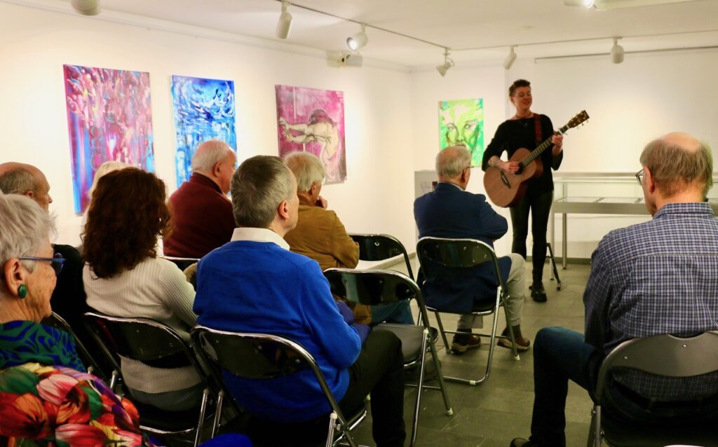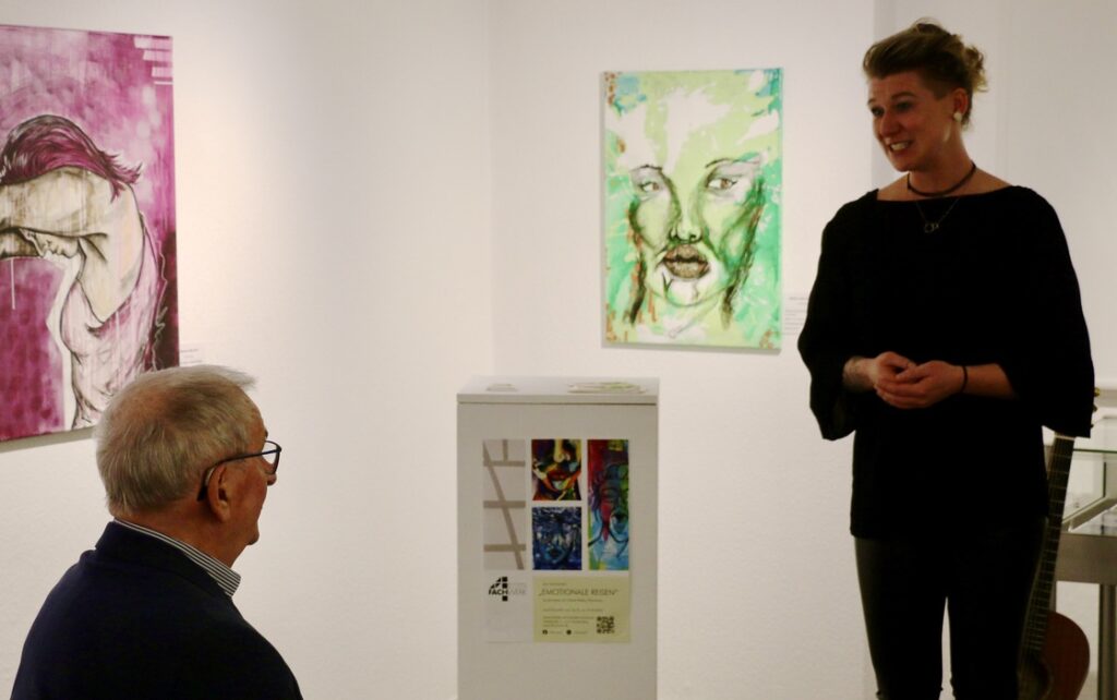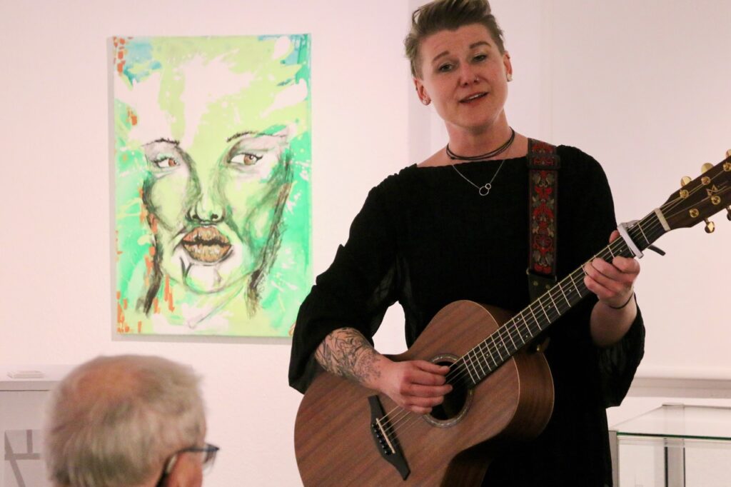 Eine Allround-Künstlerin – so konnten die Gäste Juli Nickmann zur Ausstellungseröffnung im 4Fachwerk-Museum erleben. Als Malerin präsentiert sie eine Werkschau grafisch anspruchsvoller Bilder, als Gitarristin und Sängerin sorgte sie zugleich für musikalische Höhepunkte.