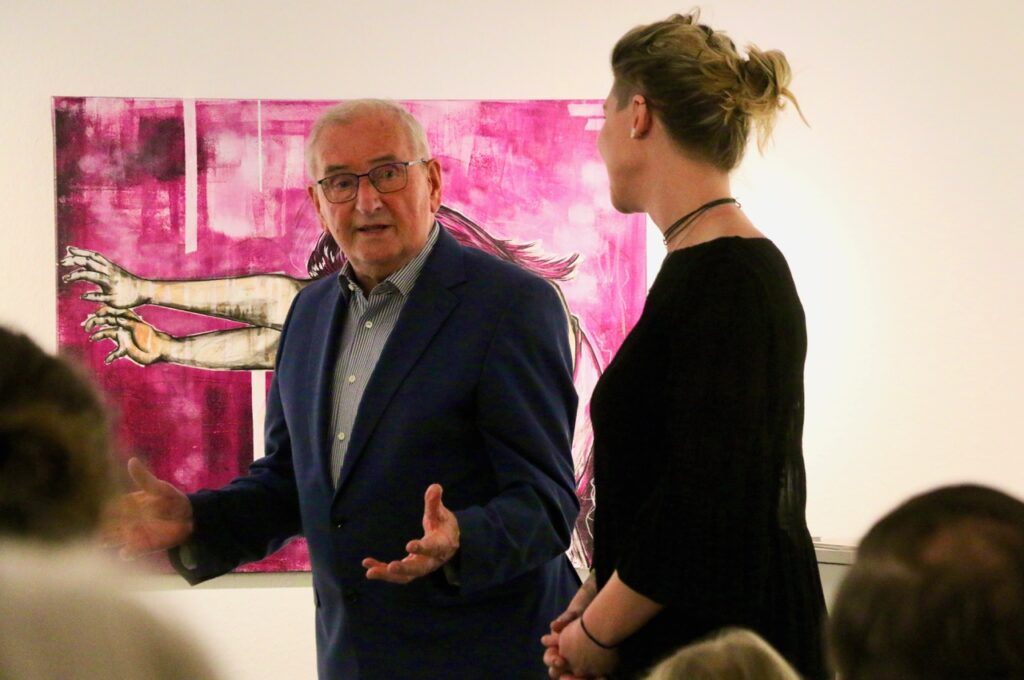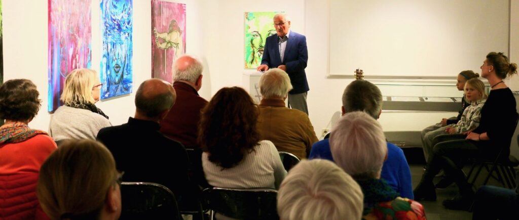 Ihren künstlerischen Werdegang schilderte Dieter Siebel in einem launigen wie warmherzigen Vortrag. Er hatte sie seit früher Zeit in ihrem künstlerischen Wirken begleitet: „ich durfte einer der Ersten sein, der eines Ihrer Bilder sehen konnte und Ihre einmalige Begabung für die Kunst erkennen durfte.“