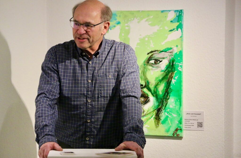 Zu Beginn stellte Dieter Siebel, Grandseigneur des Freudenberger Kulturlebens, die 1988 in Freudenberg geborene und jetzt in Hohenhain lebende Künstlerin vor. Ihre Ausbildung führte sie zunächst in den Süden Deutschlands, sie arbeite in München und kam dann doch mit Mann und Kindern wieder ins Siegerland zurück. Ein Faible für die Kunst begleitet Juli Nickmann seit Kindesbeinen, Zeichnen gehörte zu ihren Leidenschaften. Konsequent belegte sie vor ihrem Abitur den Leistungskurs Kunst. Autodidaktisch entwickelte sie sich immer weiter. „Unsere Julia zeigt ein großes Talent, Menschengesichter aus innerer Intuition heraus entstehen zu lassen, die eine tiefe emotionale Stimmung auslösen,“ so Siebel. Sie und ihr Wirken sei ihm ans Herz gewachsen und er bewundere, wie sie in kurzer Zeit die Kunstszene bereichert habe.