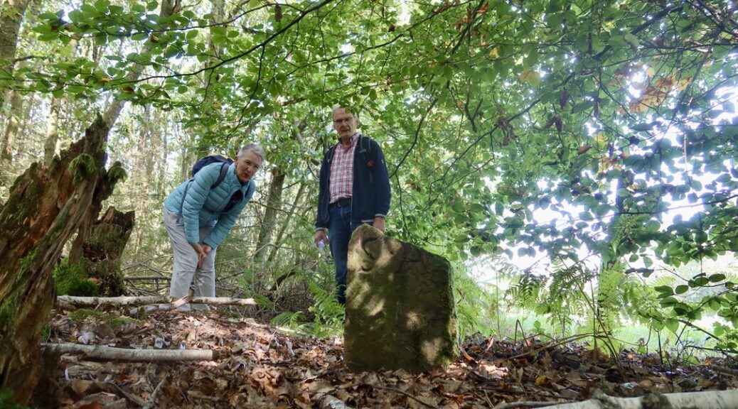 „Ich habe lange und immer wieder gesucht,“ berichtete Burkhard Leidig, aber leider ist das steinerne Dokument bislang nicht gefunden worden. Gleichwohl ist seine Existenz in zahlreichen schriftlichen Dokumenten verbürgt. Jedenfalls scheute die Wandergruppe, zu der auch Bürgermeisterin Nicole Reschke gehörte, keine Mühen, in das Waldes-Dickicht zum wahrscheinlichen Standort vorzustoßen, um dann entlang des kleinen Grenzwalles den Weg durch das dichte Gehölz fortzusetzen.